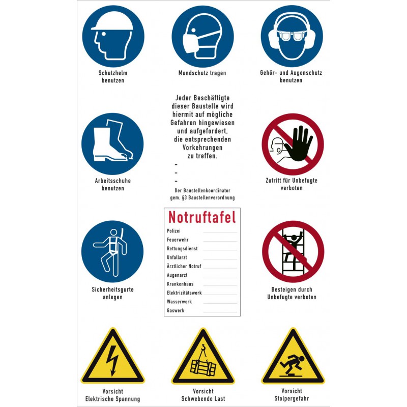 Baustellensicherheitsschild gem. §3 Baustellenverordnung mit Notruftafel zur Selbstbeschriftung,