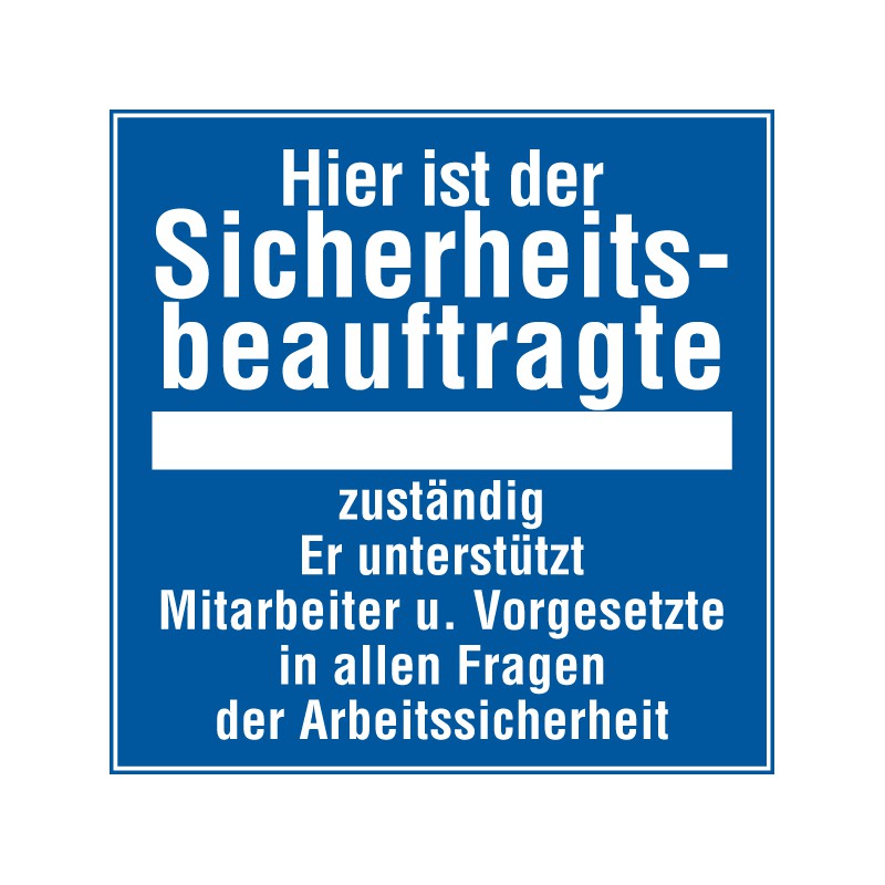 Schild "Hier ist der Sicherheitsbeauftragte ... Zuständig. Er unterstützt Mitarbeiter u. Vorgesetzte in allen Fragen der Arbeitssicherheit", mit Freifläche zur Beschriftung.
