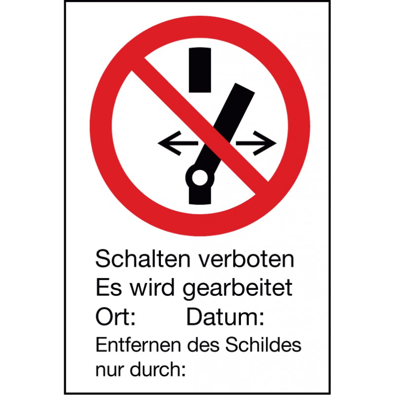 Schalten verboten Es wird gearbeitet Ort:... Datum ... Entfernen des Schildes nur durch: ...