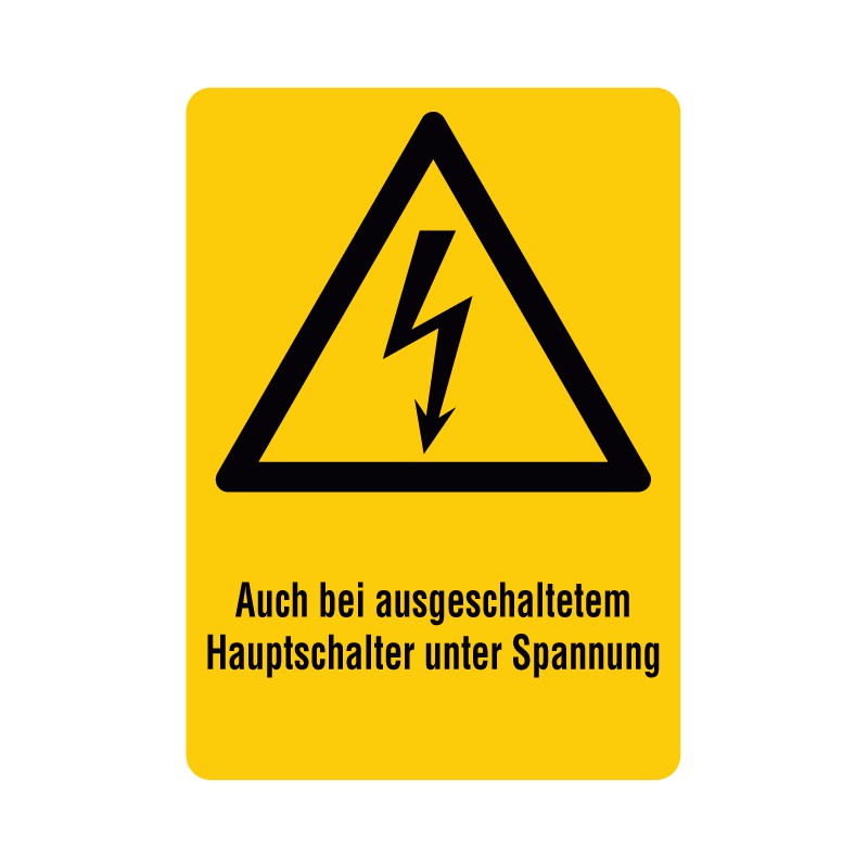 Auch bei ausgeschaltetem Hauptschalter unter Spannung, kombiniert mit Symbol Warnung vor elektrischer Spannung (W012)