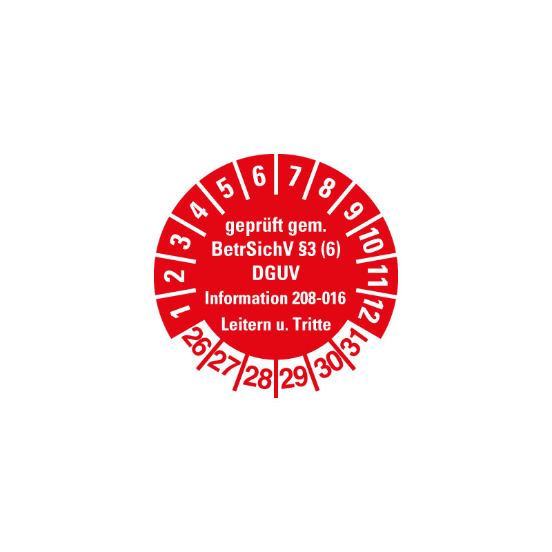 Text: geprüft gem. BetrSichV §3 (6) DGUV Information 208-016 Leitern u. Tritte