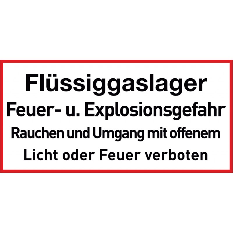 Schild "Flüssiggaslager, Feuer- u. Explosionsgefahr. Rauchen und Umgang mit offenem Licht oder Feuer verboten"