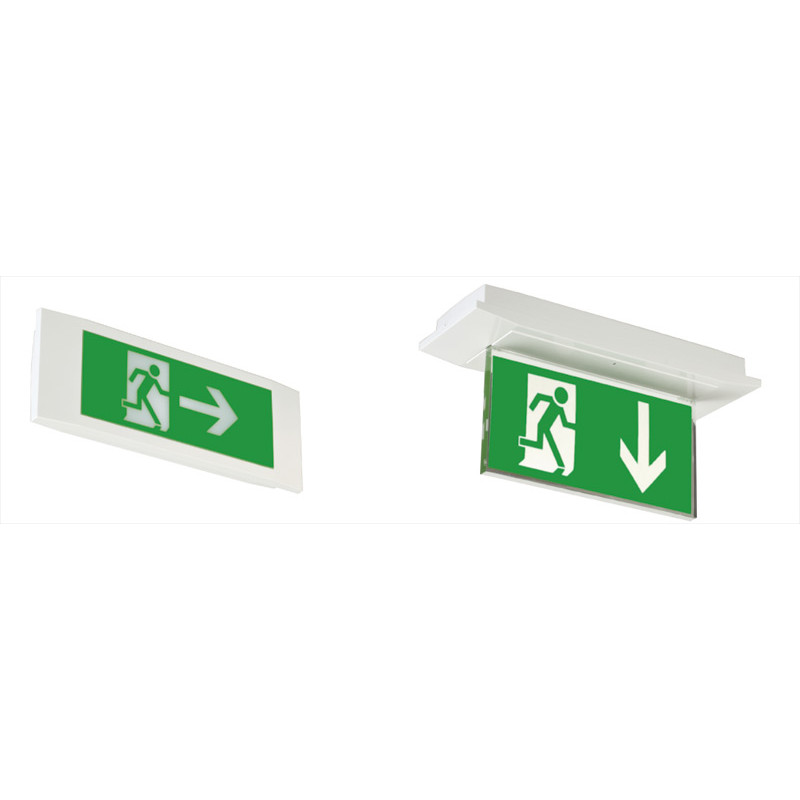 Lichtlenkung durch Reflektor. Lieferbare Versionen: für 1-seitige Kennzeichnung (Wandanbau) durch wechselbare Scheibe oder 2-seitige Kennzeichnung (Deckenanbau) durch wechselbare Display-Scheibe (Optionales Zubehör).