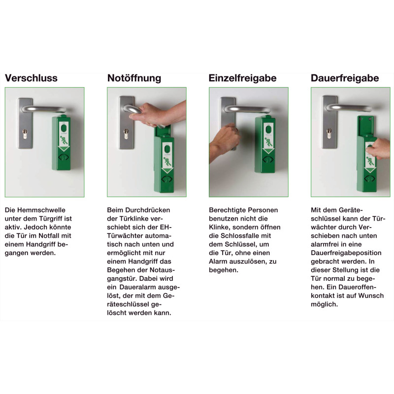 Der patentierte EH-Türwächter sichert den Notausgang und ermöglicht dessen Öffnung mit einem einzigen Handgriff.