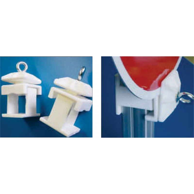 Die Kunststoff-Schilderklemme mit montierter Schraube passend für 40x40 mm Vierkant- und Rundrohre in einem Durchmesser von 42 mm.