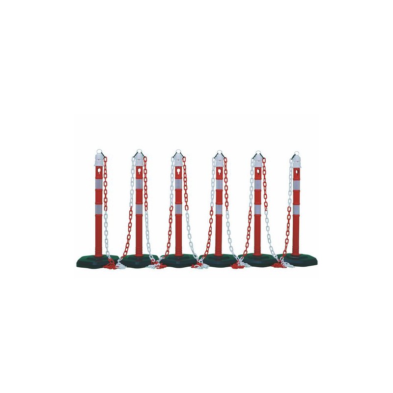 Kettenpfostenset lieferbar in Rot (Streifen retroreflektierend Klasse RA2) oder Gelb (Streifen schwarz), und in zwei Längen mit je 2 Universalhaken.